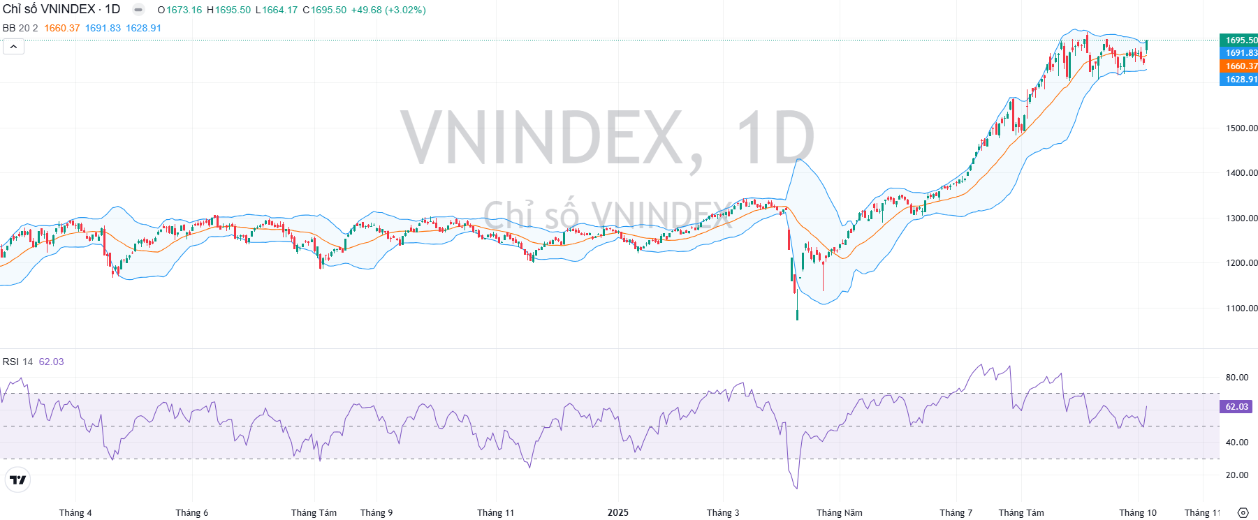 Về kỹ thuật, chỉ số VN-Index đang ở rất gần vùng kháng cự 1.700 điểm và có khả năng cao sẽ bứt phá thành công nếu thanh khoản tiếp tục duy trì. Các nhóm dẫn dắt như chứng khoán, ngân hàng và bất động sản đều có tín hiệu tích cực, cho thấy sự đồng thuận của thị trường. Dù có thể xuất hiện rung lắc ngắn hạn khi chỉ số tiến sát vùng đỉnh, nhưng mặt bằng giá của nhiều cổ phiếu vẫn đang ở mức chiết khấu sâu, giảm thiểu đáng kể rủi ro điều chỉnh mạnh.