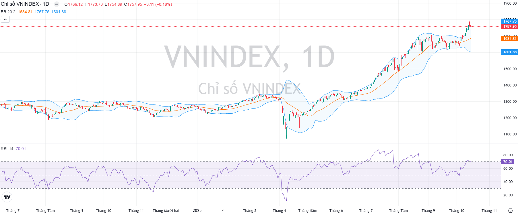 Về kỹ thuật, chỉ số VN-Index tiếp tục vận động giằng co với thanh khoản giảm so với phiên hôm qua thể hiện diễn biến kiểm tra cung-cầu trên thị trường. Chỉ báo RSI bẻ xuống từ vùng cao, tuy nhiên chỉ báo MACD vẫn hướng lên nên khả năng VN-Index tiếp tục diễn biến giằng co để cân bằng và củng cố động lực trong khoảng 1.750-1.780 điểm. Với việc xoay vòng các cổ phiếu trụ và sự phân hóa dần sang các nhóm ngành và cổ phiếu riêng rẻ, đó là tín hiệu sức mạnh nội tại, trong khi mùa KQKD quý 3 dần công bố sẽ là điểm tựa tâm lý, thu hút tiền vào các mã cơ bản tốt.