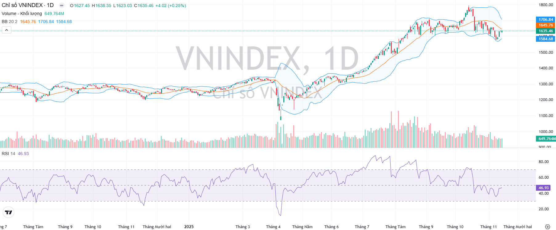 Về kỹ thuật, chỉ số VN-Index vẫn đang trong pha cân bằng tạo đáy, dù các nhịp tăng hiện tại vẫn mang tính hồi phục kỹ thuật, song những nhịp test cung vẫn đang diễn ra tốt. Nhưng chỉ khi chỉ số vượt bền vững vùng 1.650 -1.660 với thanh khoản cải thiện và xuất hiện cấu trúc đáy cao - đỉnh cao hơn, thì xu hướng thoát khỏi nhịp điều chỉnh mới được xác nhận.