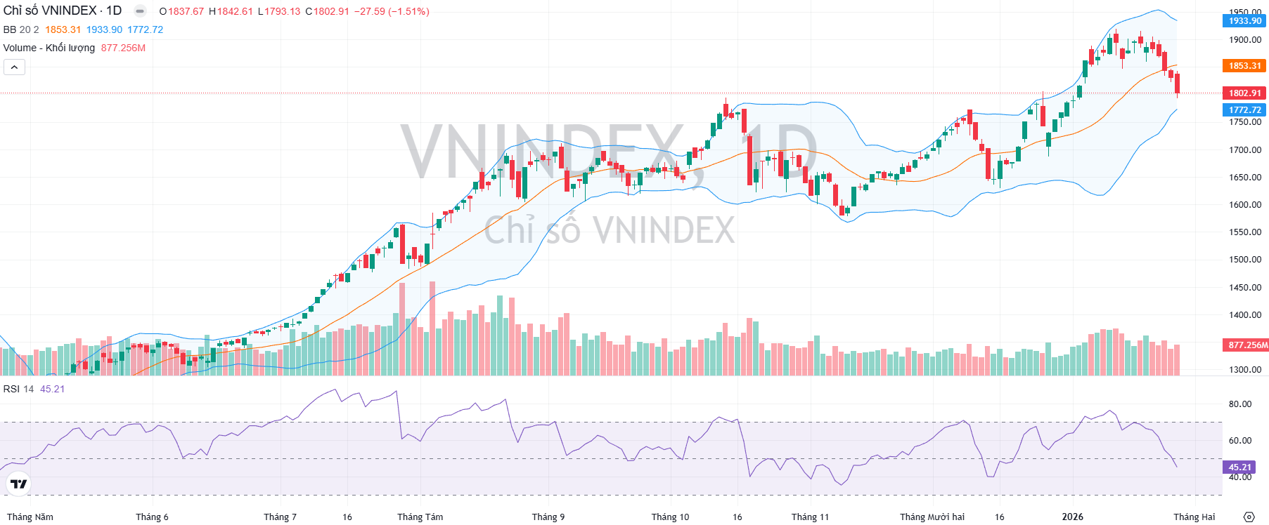 Về kỹ thuật, chỉ số VN-Index kết phiên lùi về hỗ trợ quanh mốc 1.800 điểm và đang đi dần xuống đường biên dưới của dải Bollinger, đồng thời các chỉ báo động lượng chính như RSI và MACD cũng duy trì hướng xuống cho thấy VN-Index chưa kết thúc nhịp hiệu chỉnh. Tín hiệu đáng chú ý nằm ở những mã giảm mạnh rồi hồi lại với thanh khoản tốt, đây thường là dấu hiệu dòng tiền vào và các cổ phiếu này có khả năng sớm tìm vùng cân bằng.