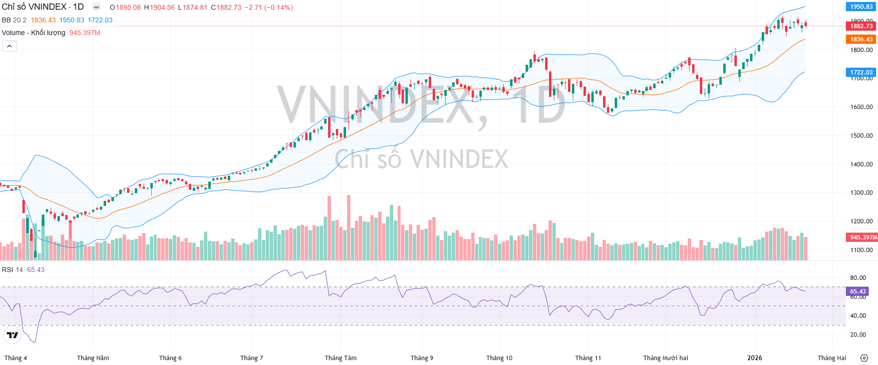 Về kỹ thuật, chỉ số VN-Index đang vận động quanh vùng hỗ trợ quan trọng tại 1.885 điểm, với chỉ báo MACD cho tín hiệu đà tăng chậm lại và các chỉ báo như RSI, MACD đều đi ngang. Mặc dù có khả năng tiếp tục rung lắc trong ngắn hạn, thị trường vẫn giữ xu hướng tăng trung hạn, nhưng động lực tiếp tục đi lên khá hạn chế do thanh khoản chưa cải thiện, nhất là trong thời gian cận kỳ nghỉ Tết kéo dài.
